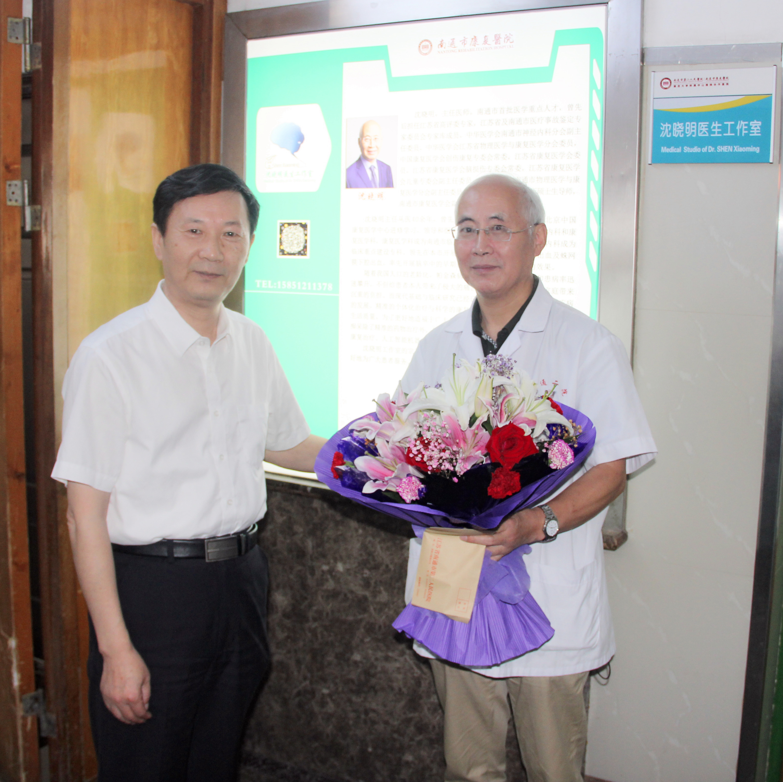 19日上午,市卫健委党组成员、机关党委书记杨国泉来到我院看望慰问市首批医学重点人才、康复医学带头人沈晓明医生,感谢他退休后仍坚守在医疗一线,刻苦钻研医疗技术,为更多的患者带来健康,叮嘱沈晓明在做好医疗工作的同时要保重身体,以更扎实的技术和更好的水平为患者服务。同时向全院医务工作者致以节日问候和崇高敬意,勉励大家努力奋斗,在提档升级关键期,促进市二院更好的发展,为健康南通做出更大的贡献。